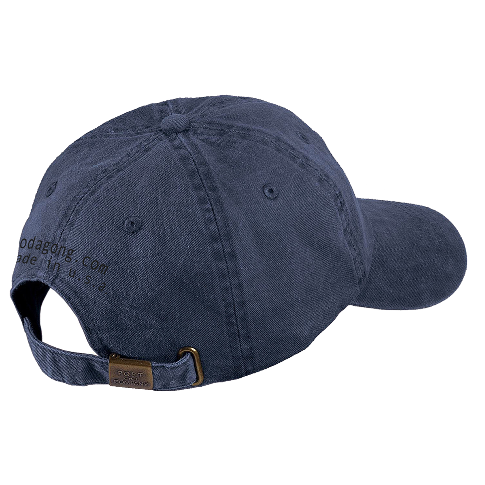 Black embroidery on denim pigment-dyed dad hat. Front/back print. Limited to 20. Designed by Alex McCullough and Niall Wynne Lewis.